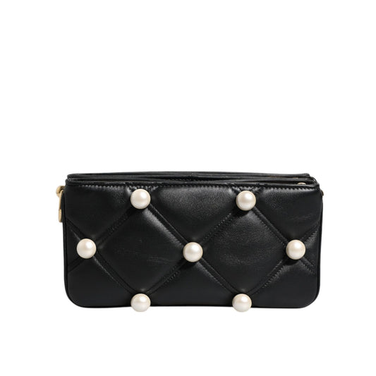 Dolce & Gabbana Black Leather Pearl Embellished Logo Shoulder Bag